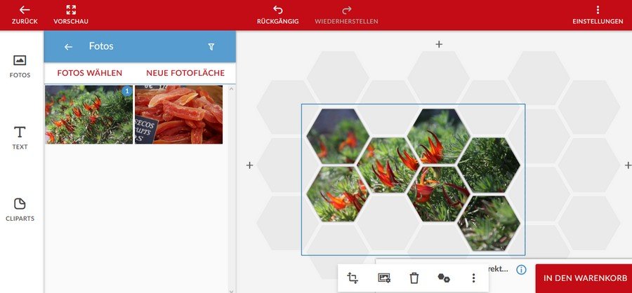 möchtest du ein Foto im Fotobuch in ein hexxas-Muster bringen oder geht tatsächlich um das Produkt hexxas als Wandbild, bei dem man entweder ein Foto auf verschiedene hexxas aufteilen kann oder jedem sechseckigen Element ein Foto zuzuordnen? Re: Wie gestalte ich ein Hexxa aus einem Foto?Genau so, aber im Fotobuch, hab es irgendwo gesehen und finde das Beispiel leider nicht mehr