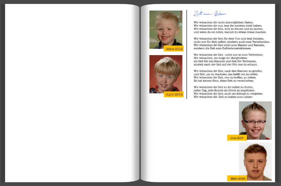 Ich bin dabei chronologisch vorgegangen, aber von hinten nach vorn und habe auch Zeichnungen, Urkunden und ähnliches eingearbeitet, sowie für ihn wichtige Ereignisse ( Sportveranstaltungen, Geburtstage, Treffen mit Freunden, Einschulung e.c.t.). Zur Einleitung habe ich einen Brief von seinen Eltern, mit Glückwünschen und persönlicher Ansprache eingescannt und auf der folgenden Seite gleiches mit Glückwünschen von Familie und Freunden. Ich hatte alle angesprochen und um einen kleinen Text oder Spruch mit Name und Unterschrift gebeten. Das Buch im Ergebnis hat alle sehr begeistert und natürlich insbesondere dem Beschenkten. Ich habe mal ein paar Seiten ausgeschnitten (Gesichter ausgegraut). Vielleicht kann dich das ein wenig inspirieren oder als Idee weiterhelfen. Liebe Grüße mohkr.