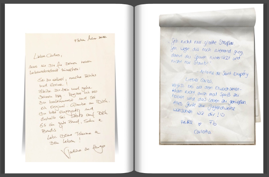 vielen Dank für deine ehrliche Meinung und der Kritik. Das Magazin soll wie eine Art Rückblick mit wichtigen und lustigen Ereignissen sein. Ich habe schon den ersten Brief mit Photoshop freigestellt. Mit der Größe der Briefe bin ich halt unschlüssig. Meine Bedenken gehen dahin, wenn ich diese Briefe zu klein mache, kann man sie nicht mehr lesen. Geschrieben sind sie alle auf A4 Größe. Wie klein kann ich sie abbilden, um sie auch lesen zu können. Grüße Isabel Re: Zeitung zur Jugendweiheisabel2104 hat geschrieben: