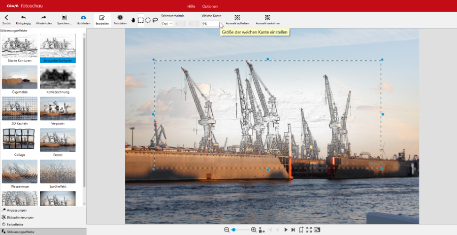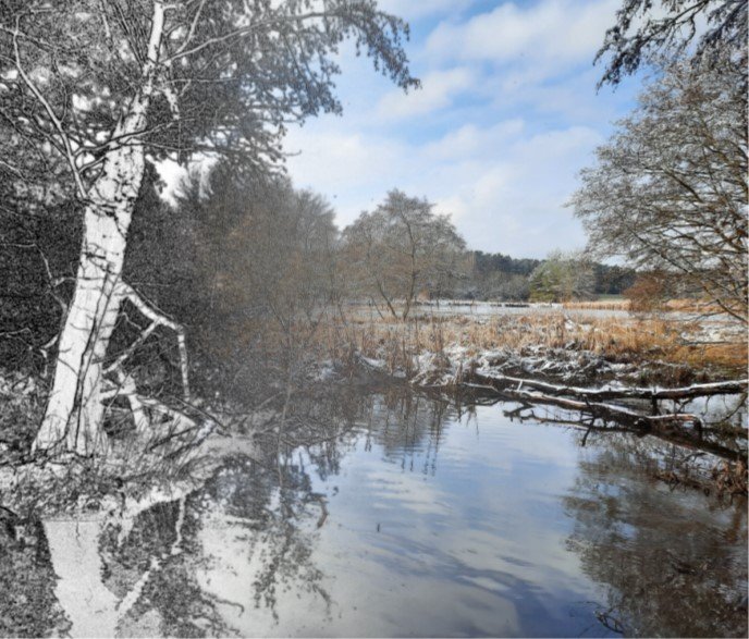 einen weiteren schönen Effekt habe ich mit der Bildbearbeitung realisiert: Ein Bild wechselt von einer Kohlezeichnung in ein Farbfoto. Ein Foto dupliziert, beide auf etwa 2/3 der Breite reduziert, eines rechts und das andere links, das linke in der Fotoschau -> Stilisierungseffekte -> Kohlezeichnung bearbeitet, beide am rechten bzw. linken Rand mit einem Verlauf versehen und dann exakt übereinander gelegt. Viele Grüsse