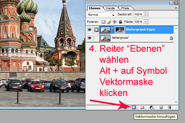 Re: Bildbearbeitung für das FotobuchSo, jetzt habe ich doch noch etwas vergessen. Bei Bild 4 muss zuerst das obere Ebenen-Miniatur-Bild angeklickt werden und dann folgt die Aktion mit der Alt-Taste und dem Klick auf das Vectormaskensymbol.