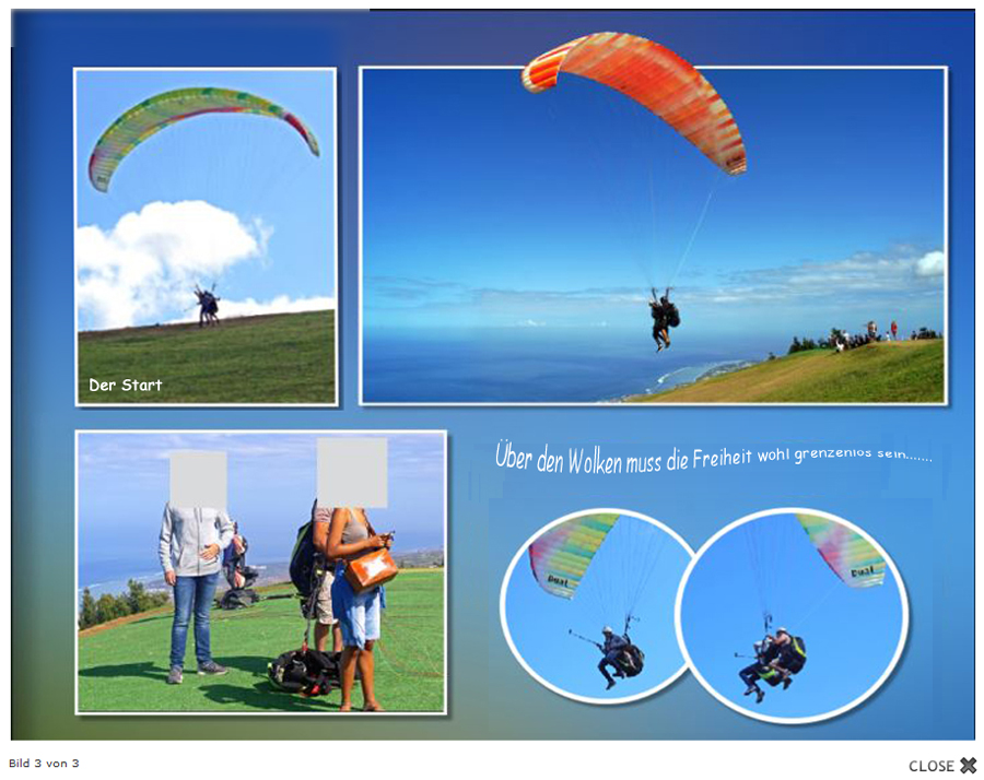Als Alternative könnte ich mir auch die Personen und das Startbild gleich schmal untereinander. daneben das schöne Fallschirmbild und auf der rechten Seite dann vollflächig eines der Flugbilder. Evtl. rund das zweite davon noch (rund mit Rand?) kleiner einblenden - ob das gut aussieht, müsste man testen. Liebe Grüße