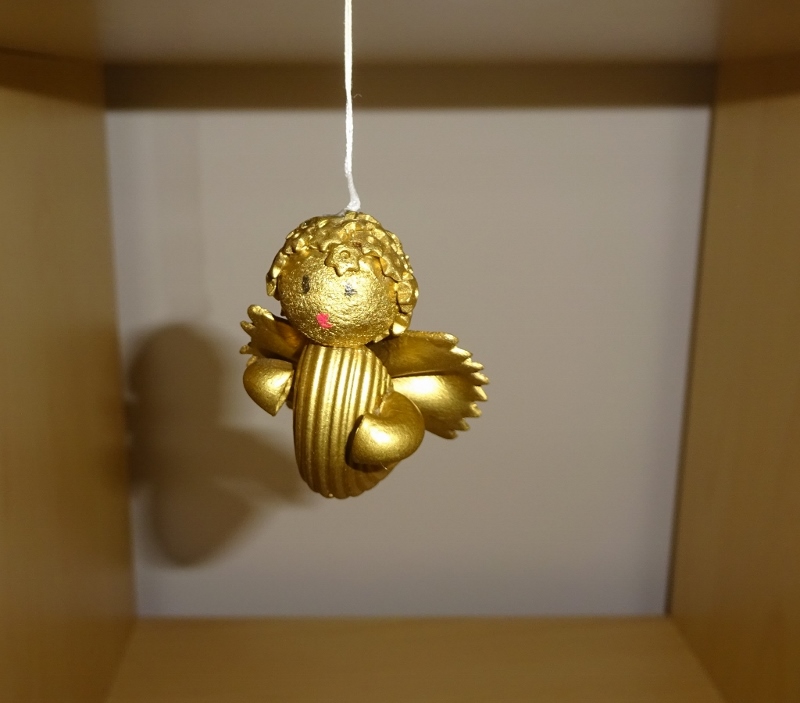 Silber-Distel Re: 10. Dezember | Kategorie: SpielDas ist mein selbstgebastelter Christbaumanhänger, ein Engel aus Nudeln.
