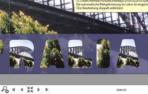 ich habe versucht dein Szenario möglichst genau nachzustellen, aber bei mir funktioniert es immer. Was mich auch irritiert, ist, dass bei dir das I offenbar den zoom-Faktor hält, aber der Ausschnitt in der Vollbild-Ansicht etwas verschoben ist. Du könntest versuchen, einen Buchstaben, der funktioniert, zu kopieren und dann die Maske eines anderen Buchstaben darüber zu legen. Ein ganz anderer Ansatz wäre, statt des Ausstanzens die Buchstaben mit einem Rand zu versehen. Hier ein Beispiel, allerdings habe ich kein Foto von Australien Re: Schrift ausstanzenLiebe Grasmücke,