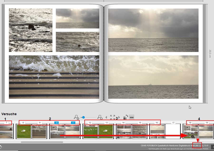 Ich habe eine Doppelseite mit 6 Fotos auf die nächste leere dupliziert und wollte dort 6 Fotos einfügen. Ich dachte, damit könnte ich die Software überlisten. Weit gefehlt! Es kam die Meldung, dass nicht genug Seiten zur Verfügung stünden und es würden 8 Doppelseiten hinzugefügt. Nach Klick auf OK wurde mein 26-Seiten-Fotobuch auf 98 Seiten vergrößert. Von meinen 6 markierten Fotos wurde aber nur 1 eingefügt, d.h. 1 der 6 vorhandenen wurde ausgetauscht. Die weiteren Seiten blieben leer. liebe Grüße