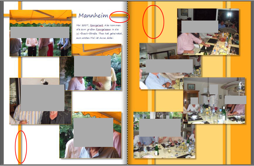 danke für Ihre Antwort. Das Problem ist in der Zwischenzeit gelöst - es waren die 0,5 cm breiten Farbstreifen, die ich nicht so angelegt, sondern mit der Maus auf diese Breite gezogen hatte. Das Buch ist in der Zwischenzeit bestellt (im Express Modus, damit es auch wirklich am Donnerstag bereit ist) und ich bin gespannt. Ich poste heute abend einige Besipiele der Seiten zur Verdeutlichung des Problems. Liebe Grüße