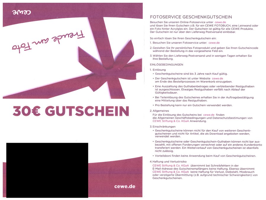 Das vermute ich, oder besser gesagt, hoffe ich ebenfalls. Nur, auf einen 2. Gutschein, den ich jetzt bekommen habe, heißt es wörtlich: "Gechenkgutscheine können nicht für den Kauf von weiteren Geschenkgutscheinen und nicht für Artikel, die als Download angeboten werden, verwendet werden. Etwas verwirrend ist, dass auf dem Gutschein nur davon die Rede ist, dass man auf der Seite cewe.de am Ende des Bestellprozesses die Gutscheinnummer angeben soll. Das klingt nach direkter Online-Bestellung, da von einer Installation der Bestellsoftware nicht die Rede ist. Ich vermute aber, dass du den Gutscheincode ebenso in der installierten Bestellsoftware mit dem Schlüssel 6822 benutzen kannst. Sollte CEWE seine Bedingungen bezüglich des Gutscheines geändert haben oder interpretiere ich hier etwas falsch? Bislang konnte man nämlich die Gestaltung, wie Okular schrieb, mit der installierten Software vornehmen und bei der Bestellung den entsprechenden Gutscheincode eingeben. Ich war jetzt mal auf der Seite cewe.de und habe folgendes gefunden und bin jetzt äußerst verwirrt: Vielleicht könnte sich CEWE zu dieser Problematik äußern. Ich selber arbeite am liebsten offline (also mit der auf dem Rechner installierten Software), bestelle dann aber online. Hoffe, dass das nach wie vor klappt... Das man bei der Verwendung eines Geschenkgutscheines ausschließlich Postversand, egal bei welchem Handelspartner, wählen kann, wissen wir ja schon. Liebe Grüße