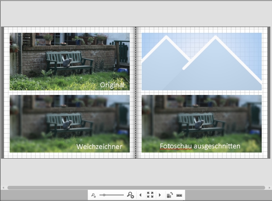 Natürlich kann man in der Fotoschau schon die umgerechnete Weichzeichnung erkennen. Bei einer Fotogröße von 4400x3300 px ist der Unterschied zwischen der vermeintlichen Weichzeichnung im Einstellungsfenster und der tatsächlich umgerechneten Weichzeichnung, wie sie nach Bestätigung mit OK im Bereich "Anpassungen" angezeigt wird, recht groß. Dazu vom Bearbeitungfenster eine Kopie erstellt und den betreffenden Bildausschnitt freigestellt. Die Ansicht der Fotoschau, verglichen mit dem Bild im Fotobuch, zeigt m.M.n keinen gravierenden Unterschied. Zwischen dieser angewendeten Weichzeichnung und der Übernahme ins Fotobuch gibt es dann natürlich keinen Unterschied mehr. liebe Grüße