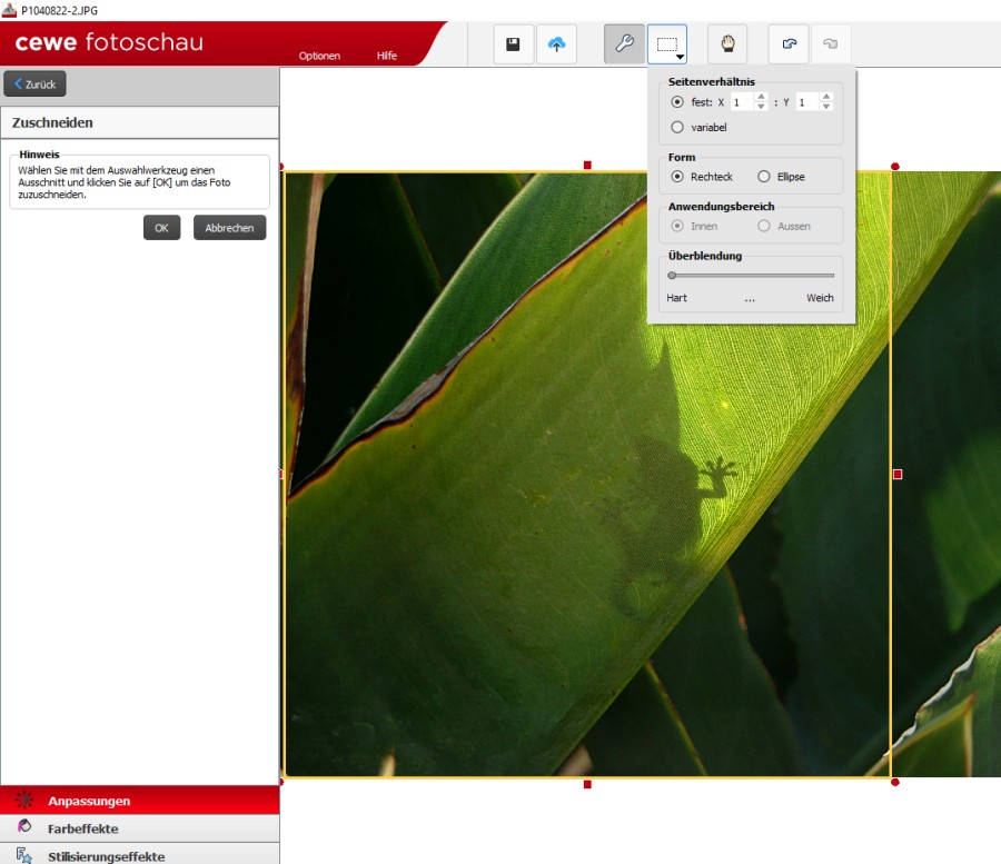 Mit den Änderungen in der Fotobuch-Anwendung änderst du ja immer nur die Ansicht im Projekt - egal, ob du an den Anfassern ziehst oder über die numerische Angabe, wie du beschrieben hast. Dein Foto wird davon ja nicht berührt. Es werden nur Teile sozusagen "unsichtbar". Das merkt man z.B. daran, dass man das Foto im Bildrahmen noch verschieben kann, es ist in seiner ganzen Breite noch da. Erst beim Zuschneiden in der Fotoschau schneidest du wirklich was ab liebe Grüße