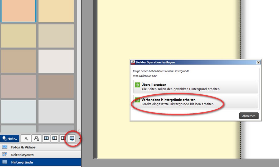 Das geht doch ganz einfach:Nach der Seitenergänzung den Button "Hintergrund auf alle Innenseiten legen" betätigen. Danach kann man entscheiden, ob bereits vorhandene Hintergründe erhalten bleiben sollen: Re: VerbesserungsvorschlagVielleicht kommt dir ja dieser Beitrag bekannt vor
