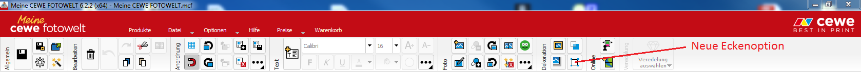 War es bisher in der Bestellsoftware nur möglich, die Bildecken mithilfe der entsprechenden Formen-Maske abzurunden, kommen nun weitere 5 Möglichkeiten, die Größen und Formen von Ecken zu definieren, hinzu. Verbargen sich unter dem Menüpunkt „Dekoration“ u.a. bisher die Ihnen bereits bekannten 3 Funktionen zum Editieren des Farbrandes, des Schattens und der Transparenz, erscheint nun zusätzlich der Reiter „Eckenoptionen“.