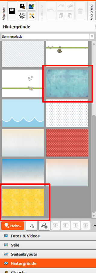 ich habe aus der Kategorie Sommerurlaub zwei Hintergründe ausgewählt. Von Seite 5 die beiden rechts oben. Zwei maritime Hintergründe. Ein Screenshot funktioniert irgendwie auch nicht :-( Sie tauchen weder unter dieser Kategorie, noch unter "Alle anzeigen" auf. Ich habe auch versucht das komplette Paket zu installieren, das funktioniert zwar an sich, aber es fehlen trotzdem Hintergründe aus dem Paket. Der Support sagte mir ich sollen den HPS Ordner auf meinem Rechner löschen und es erneut versuchen. Einen solchen Ordner kann ich bei mir aber gar nicht finden.