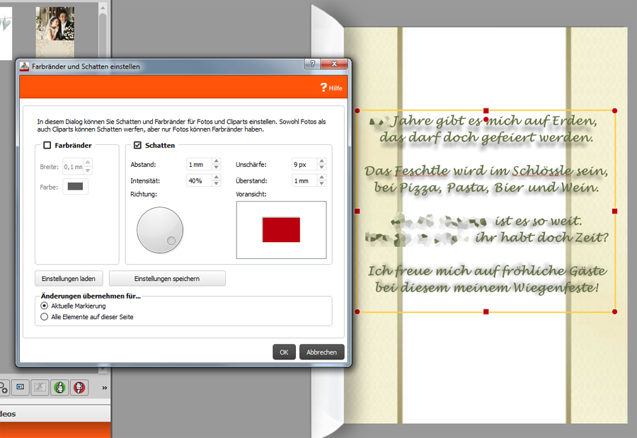 Zu den Schatten: Die verhalten sich tatsächlich etwas seltsam. Sie scheinen sich nicht mit zu drehen. Deine Schatteneinstellung schickt ja das Licht von oben, wenn du dir deinen Text auf einer Karte im originalen Querformat vorstellst, stimmt das auch mit dem Schattenwurf überein. (Außer dass er sozusagen innerhalb deines Textes liegt. Das liegt an der Unschärfe. Bei 3 px Unschärfe und Überstand 3 mm würde er nach außen übergucken.) Um einen Schattenwurf mit Licht von links oben zu bekommen, muss man die Unschärfe reduzieren und mit der Richtung und dem Verhältnis von Abstand und Überstand spielen :| . liebe Grüße
