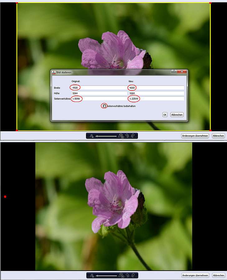 Zur Ergänzung: Es gibt Scanner, an denen man (vor dem Scannen!) das Seitenverhältnis einstellen kann. Das sollte man vorher prüfen, denn in der Tat ändert das die Bild-Proportionen und nicht nur den Bild-Ausschnitt.Einerseits sagst Du, Du hast die Verzerrung auf dem Monitor nicht gesehen 23karl03 hat geschrieben: auf dem Monitor wirkte es zu breit,