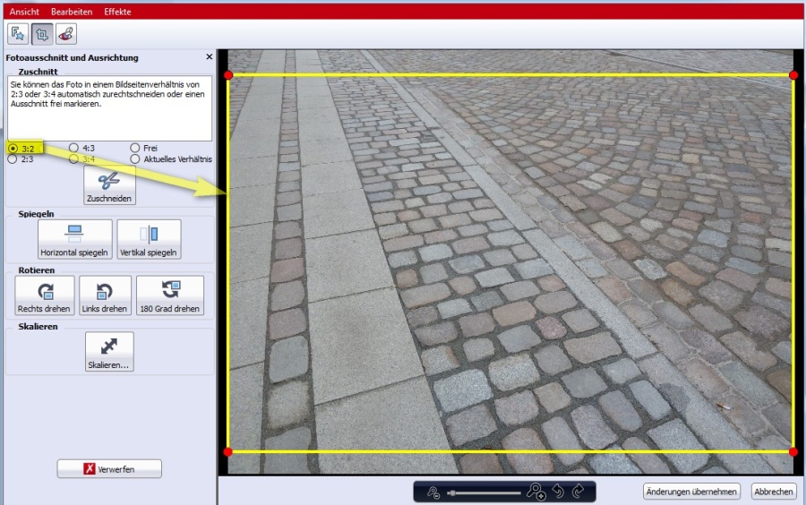 Beim folgenden Beispiel wurde das im Format 4:3 aufgenommene Motiv in das Format 3:2 geändert. Dadurch geht in der Höhe ein wenig an Bildinformation verloren. Den selben Effekt hätte man bei der Formatvorwahl in der Kamera gehabt.