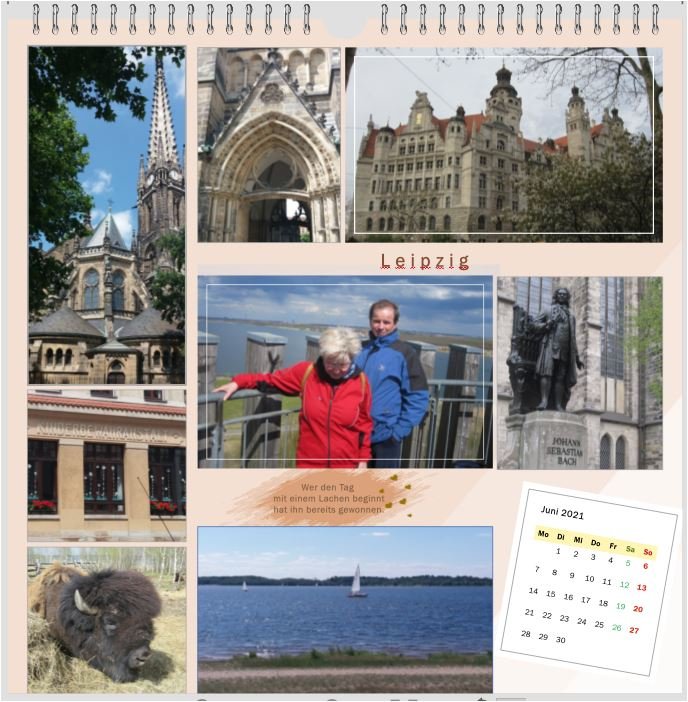 Liebe Spica,extra für Dich hier das Kalenderblatt von Leipzig, nachdem man ja niemanden hier direkt anschreiben kann. Wie ich gelesen habe, bist Du kein Freund von mehreren Fotos pro Kalenderseite. Es sind ein paar Bilder mehr geworden. Ich wollte jedoch für meinen Sohn einen kleinen Überblick erstellen und auch nicht die gängigen Motive nehmen. Das Neue Rathaus und das Bison am Cospudener See musste aber sein. Natürlich kenne ich auch andere Sehenswürdigkeiten. Ich hoffe, es gefällt Dir trotzdem. Morgen geht die Bestellung raus. Danke noch mal für Deine Ideen und Vorschlägen in diesem Jahr. Ich habe dadurch wieder viel gelernt. Wünsch Dir noch eine schöne Advents- und Weihnachtszeit. Liebe Grüße Asiafan