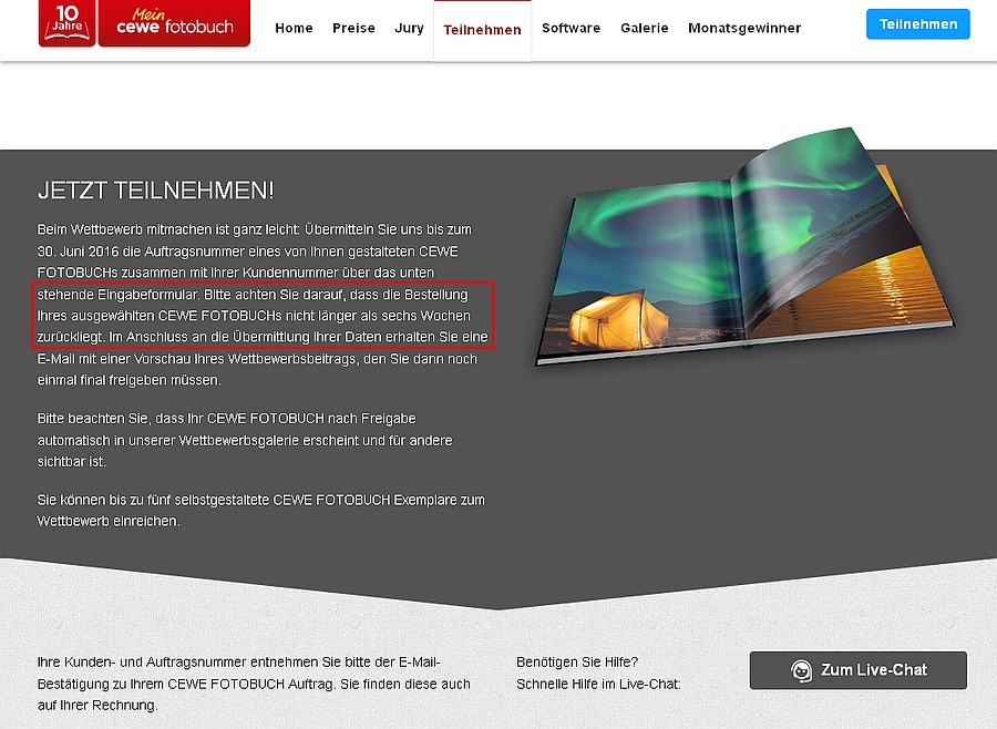 Auf der Wettbewerb-Seite (und in den Teilnahmebedingungen) steht dabei, dass die Bestellung nicht länger als 6 Wochen zurückliegen darf. Das ist die Zeit, die der Handelspartner die Daten vorhält, damit man das Fotobuch ohne Neuübertragung nachbestellen kann. Bei CEWE selbst werden sie schon früher gelöscht.
