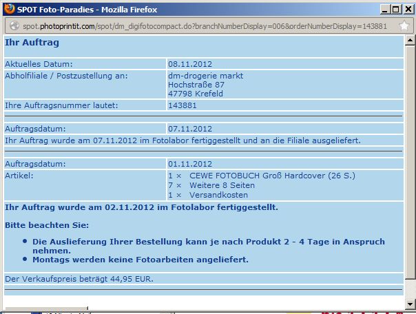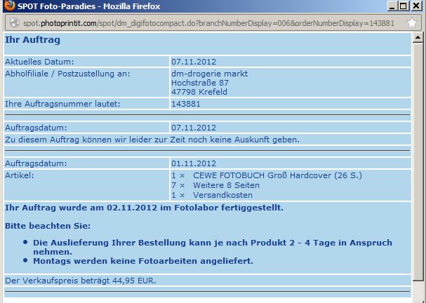 Auch heute (10.11.) ist das Buch nicht eingetroffen. Ich warte noch bis zum 20. November, dann muß das Buch neu gefertigt werden. Der Weihnachtsschlitten verläßt am 1. Dezember KR.Ihre Bestellung wurde falsch zusortiert und konnte somit nicht zugestellt werden. Die Kollegen haben mich unterrichtet, dass Ihr Auftrag heute mit der richtigen Tour verschickt wurde. Entschuldigen Sie bitte! :evil: Re: Lieferzeit unübertroffenNun bekommt deine anfängliche Aussage, dass die Lieferzeit unübertroffen sei, eine ganz neue Bedeutung