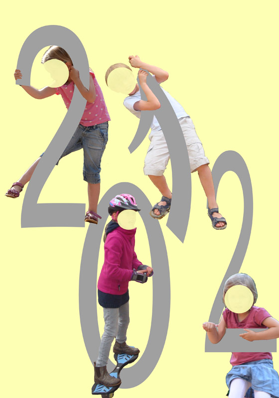 Ich habe mit Photoshop die Seiten gestaltet und als ganzseitiges Foto auf den Titel eingefügt. Dazu habe ich zuerst einen farbigen Hintergrund angelegt und dann die Jahreszahl geschrieben und den Text meinen Bedürfnissen angepasst, wie z.B. die 1 im Titel für 2012. Danach habe ich die vorher ausgesuchten Fotos der Kinder genommen und die Personen ausgeschnitten, danach die Person zur Zahl eingefügt. Bei Bedarf habe ich einen Teil der Zahl kopiert und vor die Person eingefügt. So kann man eine ganze Serie über die Jahre erstellen, die Buchrücken sind bis auf die Jahreszahl gleich. Im Original sind natürlich die Gesichter nicht überdeckt Liebe Grüße