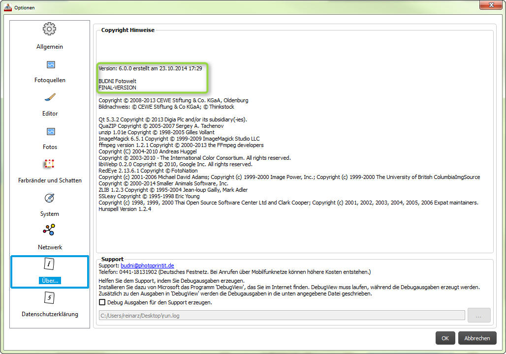 Wenn Sie Ihre Software öffnen, finden Sie in der oberen Leist den Punkt „Optionen“ hier können Sie Ihre Software anpassen, aber auch in der Kategorie „Über“ grundlegende Informationen über Ihre Softwareversion finden.