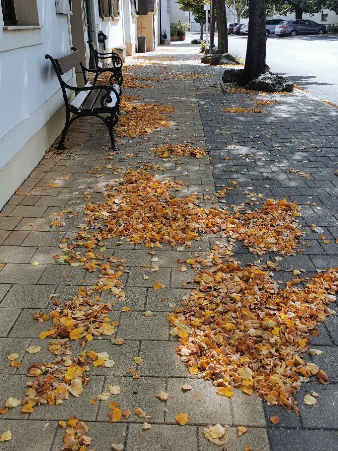 Re: Challenge 09/2021 • Der Wind pustet!Heute fotografiert: Laub auf einem Gehsteig meines Lieblingsortes im Nordburgenland.