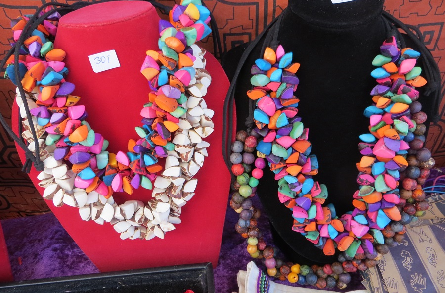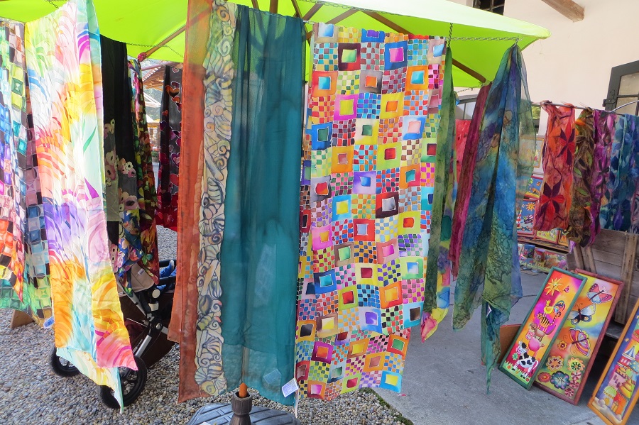 Re: Challenge 09/2016 • Jetzt wird's bunt!Gesehen auf einem Kunstmarkt in Sickertshofen - bunte Stoffe und Ketten sowie Tücher und Bilder
