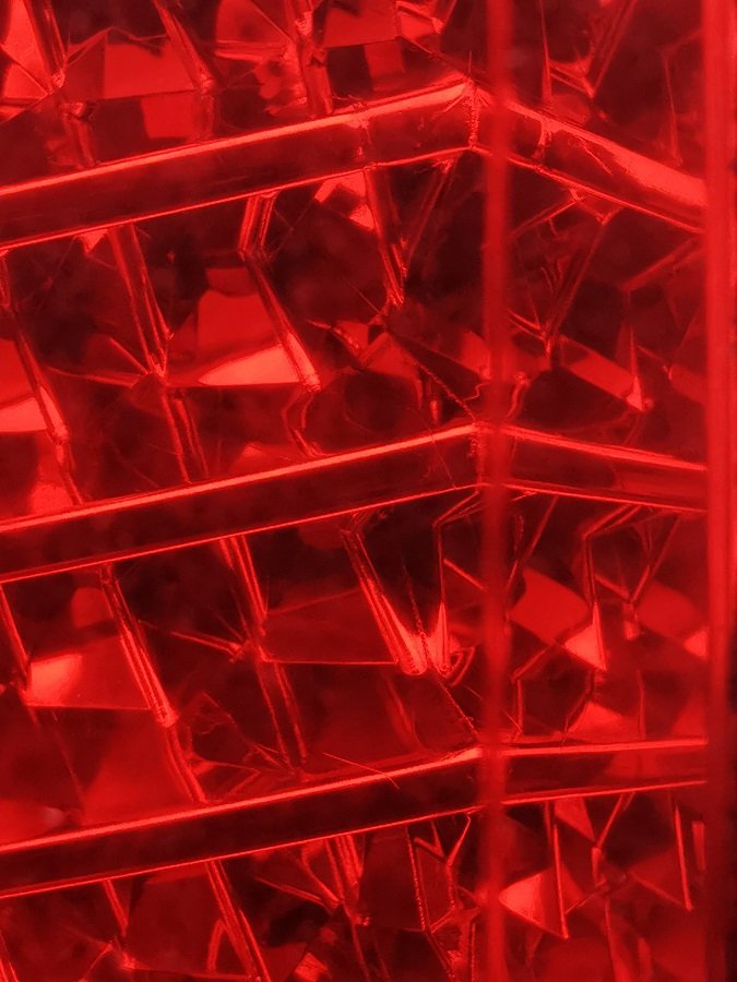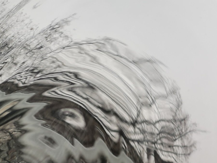 Teil eines Kunstwerks, das eine glatte Oberfläche hat. Erst in der Spiegelung erkennt man, dass unter der glatten Oberfläche eine wellenförmige Struktur ist. (Ich hoffe, ich konnte es verständlich beschreiben. Re: Challenge 01/2021 • OrangenhautSonnenschirm, der zusammengeklappt im Freien überwintert