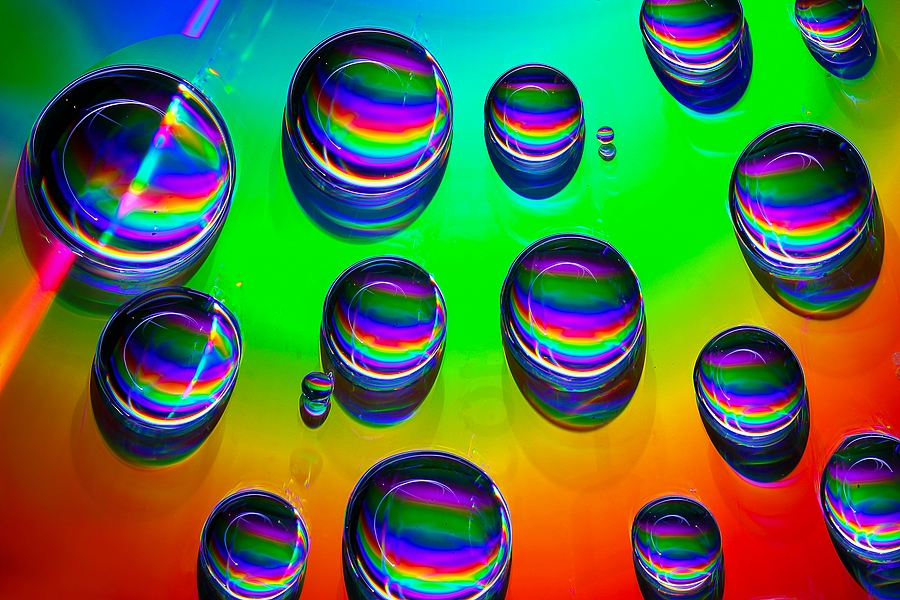 Der rot-orange-grün-blaue Hintergrund ist die CD-Oberfläche. Durch die Ausleuchtung werden die Interferenzfarben sichtbar, welche sich in den Wassertropfen widerspiegeln.