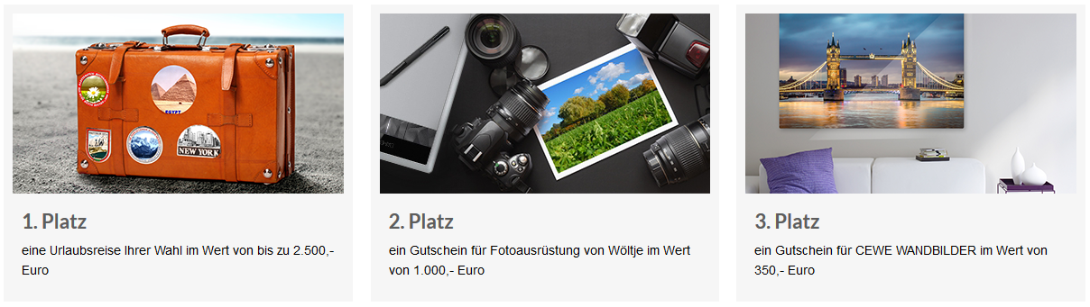 09.01.2017 – 30.06.2017 Ordnung ist die Seele in allen Dingen ... Strukturen oder Muster prägen unser Dasein. Wir begegnen Ihnen täglich in allen Lebensbereichen – werden mit Ihnen konfrontiert und schaffen sie selbst. Halten Sie mit Ihrer Kamera die faszinierenden Wiederholungen und Symmetrien, die uns umgeben, fest oder inszenieren Sie fotografisch das Besondere im Gewöhnlichen! Wir sind gespannt auf Ihre Einreichungen. Als Hauptgewinn lockt eine Urlaubsreise Ihrer Wahl im Wert von bis zu 2.500,- Euro. Der zweite Preis ist ein Gutschein für Fotoausrüstung von Wöltje im Wert von 1.000,- Euro. Als dritten Preis vergeben wir einen Gutschein für CEWE WANDBILDER im Wert von 350,- Euro. Die Plätze 4 bis 10 gewinnen jeweils einen Gutschein für CEWE Fotoprodukte im Wert von 50,- Euro. Außerdem erhalten alle Gewinner je einen Erlebnisgutschein von Jochen Schweizer im Wert von 150,- Euro. Jetzt mitmachen! Wir wünschen viel Erfolg! Sylke Re: Wettbewerb: StrukturenKurze Nachfrage zum aktuellen Stand. Wann ist mit einer Veröffentlichung der Gewinnerseite zu rechnen?