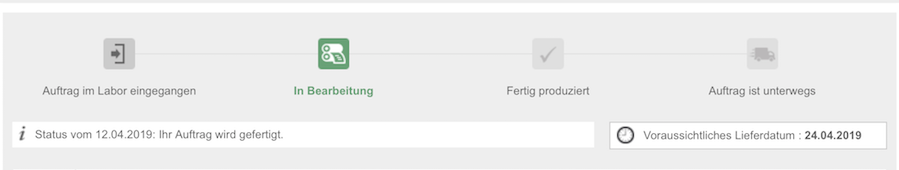 zu der Online-Abfrage kann ich keine Auskunft geben. Ich schaue direkt auf die Signale unserer Produktionsstandorte. Der Auftrag 722575 wurde uns am 12.04 um 13:54 Uhr übertragen. Da unsere Standorte nur werktags fertigen, wurde Ihr Auftrag direkt nach dem Wochenende, am Montag den 15.04 um 07:26 Uhr, produziert und für den Transport zum Versandlabor vorbereitet. Der Transport erfolgte gestern und der Standort hat den Auftrag heute für den Transportdienstleister Hermes vorbereitet. Da keine Abholung erfolgt (Ursache klären wir), verschicken wir diesen Auftrag nun per DHL an Ihre Privatadresse. Der Auftrag wird morgen bei Ihnen ankommen. Die Trackingnummer lasse ich Ihnen per Mail zukommen.