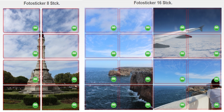 Wohin soll die Reise gehen? Dann sehen Sie genau hin. Das Ziel zeichnet sich am Horizont ab. Überraschen Sie Ihre Liebsten, Ihren Partner oder Ihre Partnerin mit unseren Fotostickern. Ob am Spiegel im Bad oder am Kühlschrank in der Küche angebracht; verteilen Sie die Fotosticker gut sichtbar in Ihrer Wohnung und legen Sie eine Fährte. Mit Ihren individuellen Fotostickern gelingt Ihnen die Überraschung auf Anhieb. Unsere Fotosticker werden auf Premium Markenfotopapier gedruckt. Für Ihre Zwecke erhalten Sie auf die Schnelle, wenn Sie möchten, bereits ein qualitativ hochwertiges Fotoprodukt. Wir empfehlen eine Auflösung von 472 x 318 Pixel, damit Ihre Überraschung auch die Aufmerksamkeit auf sich lenkt. Die Stickerbögen erhalten Sie online im Format von ca. 13 x 18 cm in drei unterschiedlichen Ausführungen.