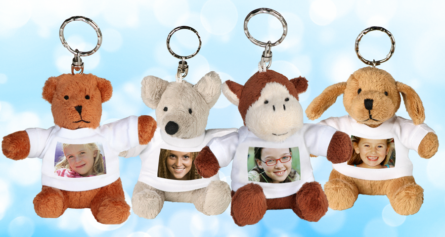 Sie sind klein, weich und immer gut gekleidet: unsere tierischen Schlüsselanhänger. Neben den großen Plüschtieren finden Sie im Bereich Spiele auch unsere kleinen Tierchen-Anhänger. Die vier Begleiter achten auf Ihre Schlüssel, gehen mit Ihnen an Ihrer Tasche auf Reisen oder achten auch gerne auf Stifte in Federmappen. Ob Sie sich nun für Bruno den Bären, Harry den Hund, Moni die Maus oder Arno den Affen entscheiden, alle vier kommen garantiert mit Ihrem Wunschmotiv auf Ihrem T-Shirt. Auf die Vorderseite des kleinen, weißen Shirts können Sie ein Fotos Ihres Liebsten platzieren und vielleicht sogar einen kleinen Spruch? Beachten sollten Sie jedoch, dass die maximale Druckfläche eine Größe von 3 x 2 cm hat. Wählen Sie daher Ihre Worte mit Bedacht und in einer klaren Schrift. Auch Gruppenbilder werden auf dieser kleinen Fläche nur schwer erkennbar sein. Ein Einzelporträt steht Ihrem tierischen Anhänger jedoch jederzeit hervorragend. Mit 9cm sind die kleinen Tiere handlich und fallen kaum ins Gewicht, sodass Sie sich zur Not auch mitsamt Ihrem Schlüssel in der Hosentasche verstecken können. Sie bleiben jedoch auch gerne an der frischen Luft, wenn die Hosentasche nur für den Schlüssel Platz bietet. Mit dem enthaltenen Metallring können Sie Ihren plüschigen Freund auch jederzeit flexibel vom Schlüsselbund an die Handtasche oder den Schultornister wechseln lassen. Die Tierchen-Anhänger können Sie sowohl über die Software als auch online bequem bestellen. Auch als Geschenk erfreuen die tierischen Begleiter jeden. Oder könnten Sie zu diesen kleinen Knopfaugen vielleicht „Nein“ sagen? Zuletzt als neu markiert von Sonja am 22.05.2014, 08:34. Liebe Grüße