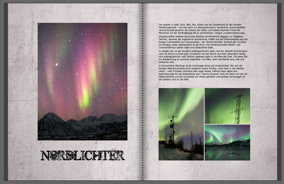 D.h. ich lege mein Gestaltungsraster immer so an, dass ich die aufgeklappte Seite als Ganzes betrachte. Dabei ziehe ich ganz oft Fotos über den Bundsteg hinaus.