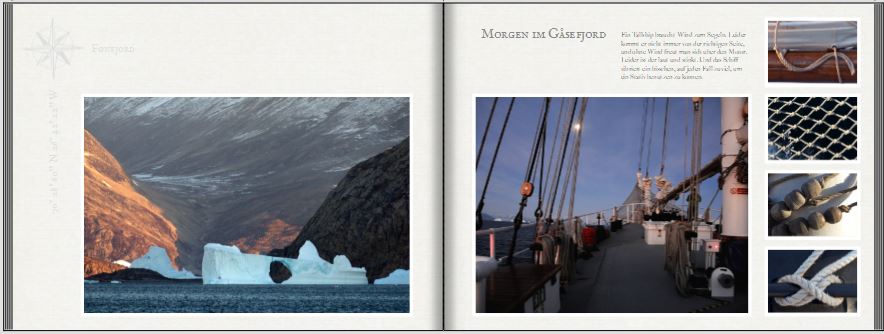 Re: 12. Dezember | Kategorie: KreativesEinband und zwei Doppelseiten aus meinem Kreuzfahrtbuch. Was man hier nicht so gut erkennt: alle Bilder haben einen weißen Rand, die Seiten haben einen ganz hellbeigen, strukturierten Hintergrund. Auf mattem Papier sieht das toll aus.