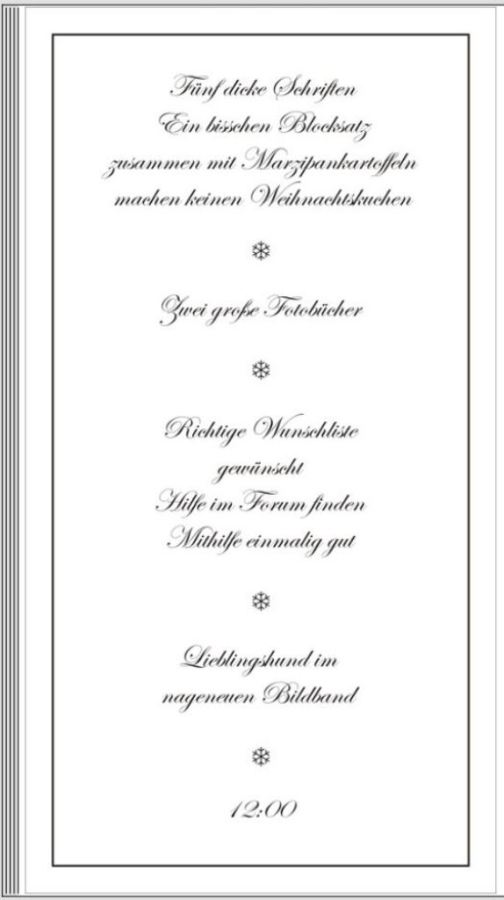 Re: 12. Dezember | Kategorie: KreativesDSL-schnell hat geschrieben: Die Schrift ist zu "gekringelt" bzw. das Bild zu klein ...