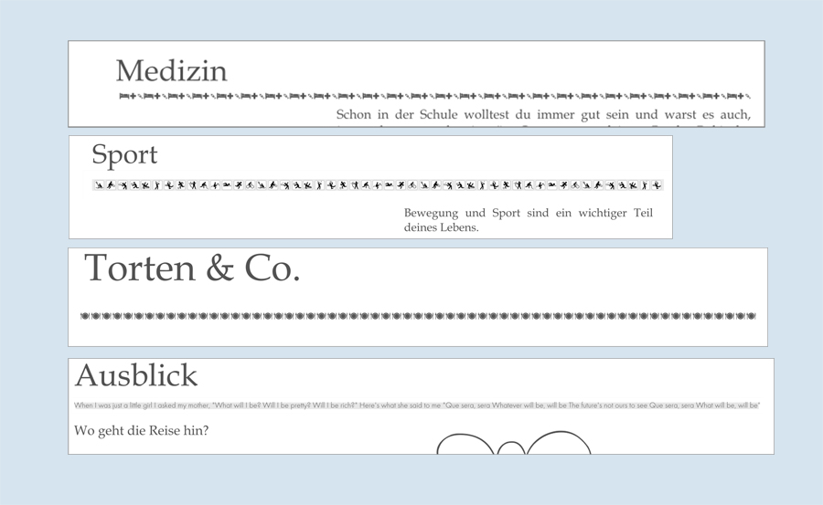 Für die meisten Trennstriche habe ich zum Thema passende Dingbats genommen. Bei der Überschrift "Ausblick" habe ich dann den Text von "whatever will be will be" hineingefieselt. Ich weiß nicht, ob man es hier noch lesen kann; im Fotobuch gehts grad noch.