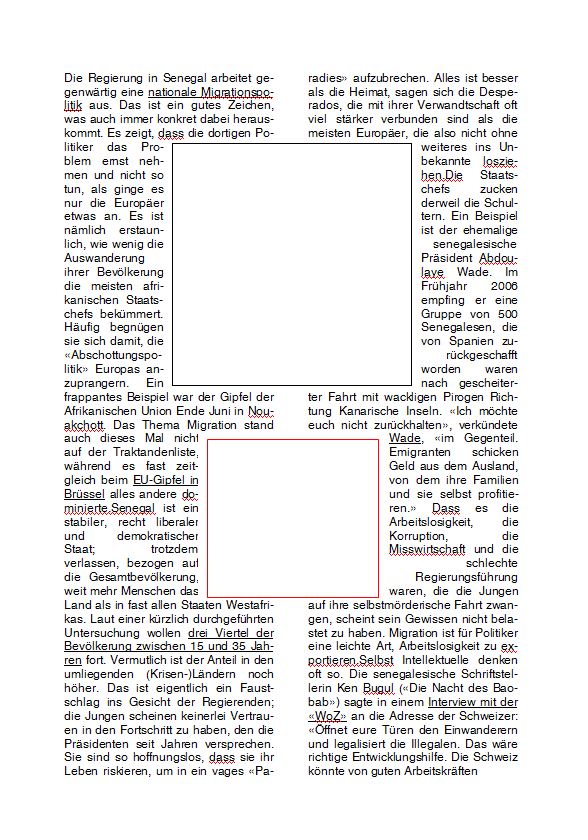 ich zeige dir mal bildlich, wie du einen Platzhalter in word in einen (hier zweispaltigen) Text einfügst. Ich habe über Einfügen/Formen ein Rechteck eingefügt. Ich habe es zum besseren Erkennen grau gefärbt. Es sollte aber weiß sein. Für dieses Rechteck lege ich unter Zeichentools/Format/Zeilenumbruch "Passend" fest und schon läuft der Text um das Bild. Da ist jetzt noch nichts ausgerichtet, meine Zeit reicht gerade nicht Bei einem Textfeld funktioniert das nicht, sondern nur, wenn du die Seite dann als pdf ausgibst. liebe Grüße