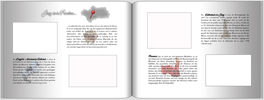 Mir gefällt dein neuer Entwurf viel besser. Die Breite der Textfelder muß natürlich noch der Breite der Platzhalter für die Fotos angeglichen werden. Auf jeden Fall würde ich aber einen anderen Font wählen. Schreibschrift eignet sich m.E. nicht gut für Textblöcke. Sie liest sich viel schwerer als eine klare Druckschrift und sieht als Blocksatz auch nicht sehr schön aus. Ich wünsche dir weiterhin gutes Gelingen und Spaß am Gestalten.