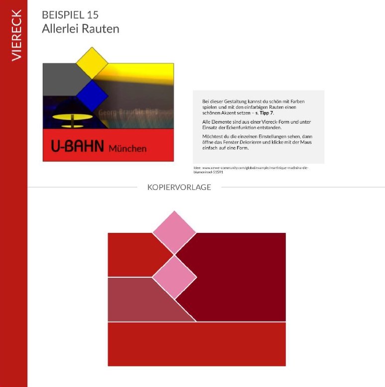 vielen Dank für Eure Hilfe. Das Formenbuch war mir doch bislang tatsächlich entgangen... Wieder toll, was ihr da geleistet habt! Ich war tatsächlich nur auf der Rauten-Schiene und Kunigunde hat mich auf einen ganz einfachen Weg geführt! Mal sehen, wie meine Bastelei wird. Das Wetter ist ja derzeit eher für indoor-Aktivitäten geeignet Re: Wie geht diese Gestaltung?Ich schließe mich gleich mal an: Eure beiden Vorlagenbücher "Einfach in Szene gesetzt" und "Formen-Baukasten" sind ganz toll. Obwohl ich überwiegend im Querformat arbeite, habe ich sie mal gleich für alle drei Formate gedownloadet. und die passenden Farbflächen, Muster und Verläufe habt Ihr gleich mitgeliefert ...