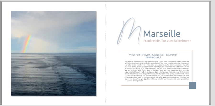 ich bin bereits seit längerem mit meinem FB über unsere Kreuzfahrt im westlichen Mittelmeer beschäftigt. Aktuell stoße ich nun auf das Problem, dass mir 130 Seiten (LayFlat) nicht ausreichen. Ich frage mich nun, ob ich total aussortieren soll, oder ob ich auf 2 Bände ausweiche. Deshalb meine Frage an euch: mein Grundgedanke war, dass ich für jeden Hafen auch eine Seite mit "Bon Jour" etc, und in der Konsequenz auch eine Seite mit "Aurvoir" bzw, Costa Smerarlda nimmt Kurs auf ...."" erstelle. Ich stelle mir nun die Frage: Braucht es die Seiten wirklich, oder ist das langweilig. Anbei sende ich Euch als Beispiel meine ersten Versuche. Danke für eure Meinung. LG Sandermichel