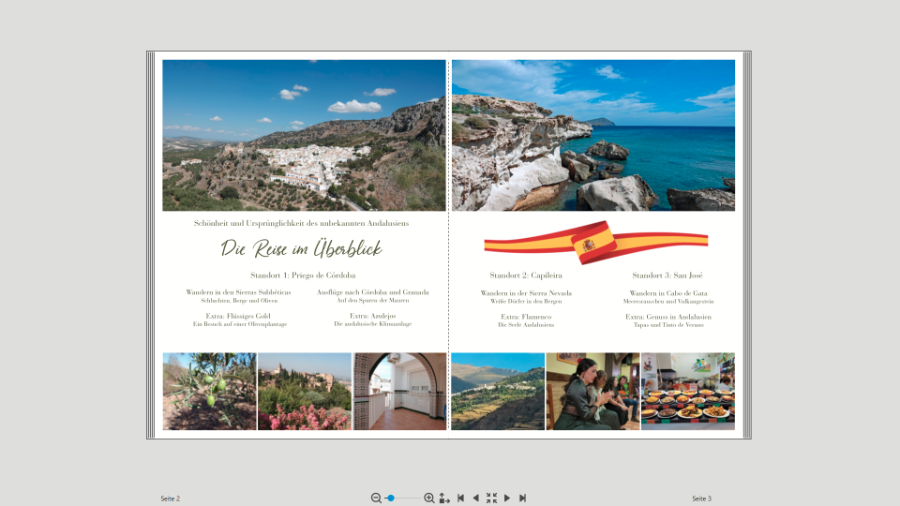 Das hat mir nicht so gefallen, das Problem ist, dass wir an 3 Standorten waren, von daher war eigentlich die Aufteilung von 2 x 2 Spalten auch falsch. Ich habe das jetzt etwas abgeändert.Bei der Hotel-Seite habe ich den Rahmen weggelassen, ob ich die beiden Linien rechts drin lasse, überschlafe ich noch. Aber ich denke, mit einem farbigen Textbereich sieht es besser aus. Ich habe ein Grün aus der Olive nebenan gewählt und das mit Transparenz hinterlegt, ist aber jetzt schlecht im Screenshot zu erkennen. Dann hab ich gleich noch zwei Seiten für Euch, die eine ist meine Idee, wie ich die Wanderseiten des jeweiligen Standortes einleiten möchte, die andere ist von der ersten Wanderung. Da tue ich mir etwas schwer, die Fotos anzuordnen, da teilweise die Berghänge nicht zusammenpassen. Freue mich auf Eure Antworten! @Asiafan: habe leider keinen Laptop, sonst könnten wir am Samstag gemeinsam dran werkeln