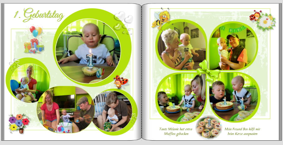 leider durfte das Buch von Klein-Willy nicht veröffentlicht werden - es waren (natürlich) auch Bade-Bilder dabei. Aber ihr habt mir immer wieder mit der Gestaltung geholfen - und daher möchte ich gerne wenigstens hier noch ein paar Seiten aus dem fertigen, pünktlich zu Weihnachten verschenkten und inzwischen für mich nochmal nachbestellten Fotobuch vom ersten Lebensjahr zeigen. Zunächst die eine Seite vom Weihnachts-Shooting... nach Rücksprache mit meiner Tochter habe ich dann doch noch das viele Grün auf der rechten Seite weggelassen: Das grelle Grün auf der Geburtstags-Seite hat uns beiden gefallen, das Buch ist sowieso sehr bunt und wir lieben Farben: Die folgende Seite fand ich immer total witzig - und habe auch noch die passenden emojis dazu gefunden: Dann war da noch das Frühlings-Shooting... das mit den Blättern habe ich auch hier aus dem Forum gelernt: Und hier mal noch die letzte Seite im Buch... alle 12 Monate auf einmal: Danke nochmals für eure stetige Hilfe, über dieses Fotobuch freuen wir uns alle sehr... LG Frau Fotolust Re: GestaltungWelch schöne Erinnerung an das erste Jahr eures Sonnenscheins! Vielen Dank dass du uns noch ein paar Seiten gezeigt hast. Sie sind wirklich sehr schön geworden.