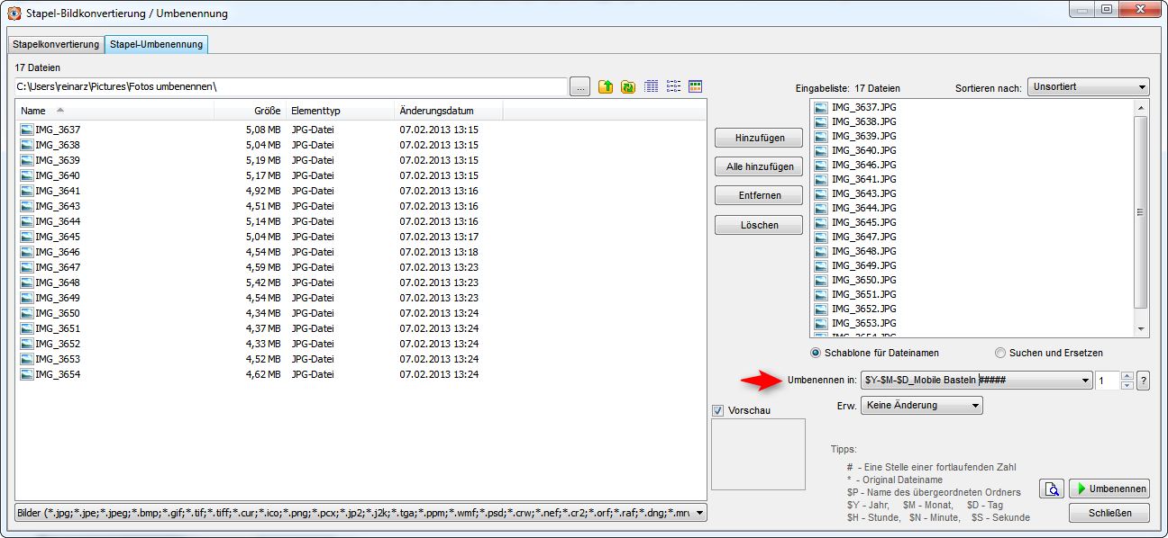 Meist macht man jedoch mehr Aufnahmen, als vielleicht nötig, um sich anschließend das beste Bild aussuchen zu können. Bei einer Vielzahl von Bilder kann einzelnes Umbenennen zu einer großen Aufgabe werden.