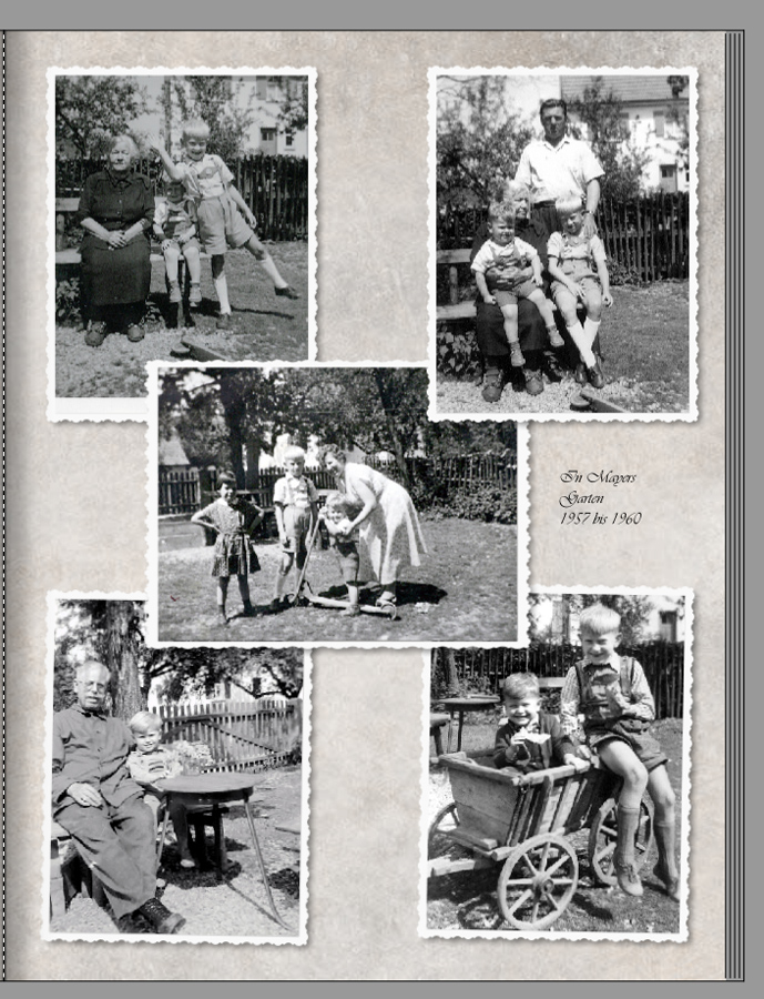 Die meisten alten Fotos haben die schönen Zackenränder von damals, einige sind beschädigt, andere durch einen Brand, der in den letzten Kriegstagen des zweiten Weltkriegs noch gelegt wurde, angekokelt und teilweise verbrannt. Ich wollte die Fotos im Buch möglichst authentisch darstellen und habe am Buchanfang fast alle Fotos in Photoshop ausgeschnitten und als PNG-Datei (mit transparentem Hintergrund) eingefügt. Bei einigen habe ich allerdings auch Fotoecken verwendet, die in der 5.1.3 unter "Rahmen & Masken" bei "Film" zu finden sind. Vor allem bis zum Übergang von S/W- zur Farbfotografie, als einige der Fotos Zackenränder hatten, andere schon mit glattem Rand oder ganz ohne waren, habe ich auch Zackenränder aus dem Cewe-Pool "Film" genommen. Ich wollte mal sehen, was ihr davon haltet und vielleicht ist es auch für den einen oder anderen eine Gestaltungs-Anregung.