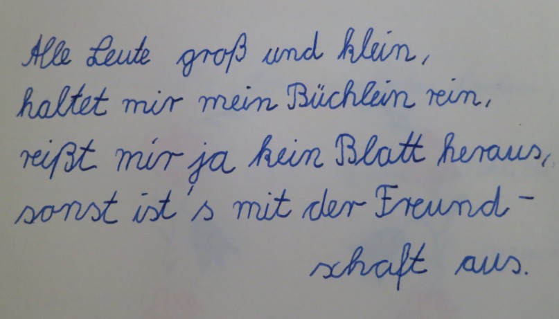 das hieß zu meiner Zeit: Poesiealbum! Und so waren auch die Sprüche, was Kinder eben unter Poesie verstehen. Da stand z.B. ganz sinnreich: Liebe ein Mutterherz, solange es schlägt. Wenn es gebrochen ist, ist es zu spät. Es wurden aber auch Dichter bemüht, z. B. Goethe: Hilfreich sei der Menschen, edel und gut! Oder Weisheiten aus dem botanischen Bereich: Rosen, Tulpen, Nelken, alle Blumen welken. Nur die eine nicht, die da heißt Vergißmeinnicht! Ich habe dieses Büchlein noch und amüsiere mich von Zeit zu Zeit darüber. Eins habe ich aber festgestellt, selbst der größte Schmierfink hat sich Mühe gegeben, ordentlich zu schreiben. Kein Wunder, denn mein Hinweis auf der ersten Seite lautete folgendermaßen: Wer ins dieses Büchlein schreibt, den bitte ich um Sauberkeit! Ja, so war das damals in den 60ern! LG Bäuerin