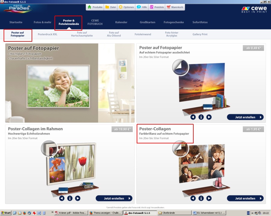 Hallo Blicki,wollte gerade eine Collage noch mal nachbestellen (erstellt mit Fotoparadies 5.0). Collage kann ich öffnen aber nicht bestellen, weil das Produkt nicht im Warekorb auftaucht. Es öffnet sich immer meine derzeitige Version von CEWE-Fotobuch 5.1.5. Bin Rudi ratlos und irgendwie orientierungslos LG Blicki ich nehme an, Du startest das Ganze, indem Du Doppelklick auf die Collage machst. Gehe mal den anderen Weg. Öffne erst dm-fotoparadies 5.0 und von dort Datei öffnen -> die entsprechende Collage Gruß DSL-schnell Gruß DSL-schnell