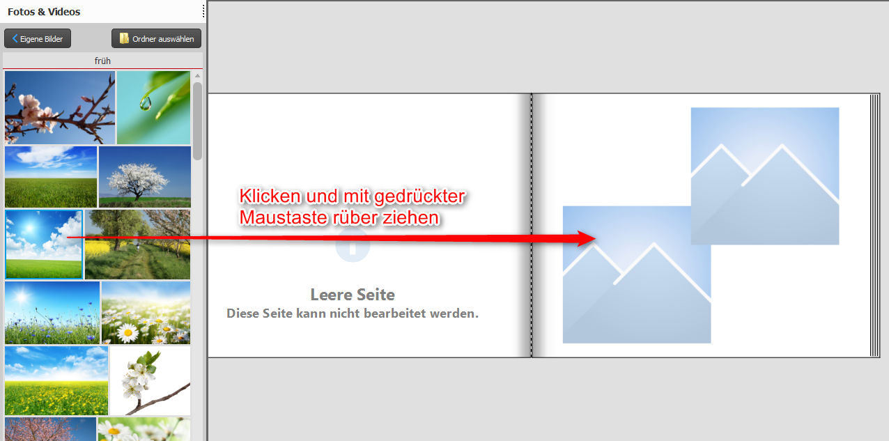 Sollten Sie sich dafür entscheiden Ihr Projekt vollkommen ohne den Assistenten zu gestalten, dann haben wir hier einige der wichtigsten Grundschritte für Sie zusammengefasst. - Bilder einfügen Um Ihre Fotos in das Projekt einzufügen haben Sie einige Möglichkeiten. Die gängigste und leichteste ist es Bilder mit gedrückter Maustaste auf die Seite zu ziehen. Klicken Sie also ihr gewünschten Bild an, halten die Maustaste gedrückt und legen Sie das Bild auf den weißen Seiten ab. Nur Bilder genügen Ihnen nicht? Dann können Sie selbstverständlich auch Texte in Ihr Projekt einfügen. In Ihrer Werkzeugleiste oberhalb der Buchseiten finden Sie hierfür den Bereich "Text". Mit einem Klick auf das Symbol mit dem gelben Plus können Sie einfach ein neues Textfeld in Ihre Buchseite legen. Natürlich können Sie auch bei der Anordnung Ihrer Bilder variieren. Dafür finden Sie links den Reiter "Seitenlayouts". Hierrin können Sie einige Vorlagen finden, wie Sie die Bilder auf einer Seite legen können. Die Layouts können Sie ebenso einfach anwenden, wie Sie Fotos einfügen können, in dem Sie das gewünschte Layout anklicken und mit gedrückter Maustaste auf die Buchseite ziehen. - Bildrahmen verändern Die Bilder auf Ihrer Arbeitsfläche im Editor können Sie vollkommen varibel verteilen. Wenn Sie einen Bildrahmen anklicken, werden Sie sehen, das rund um dieses Objekt unterschiedliche Anfasser erscheinen. - weitere Elemente Ebensoleicht wie Bilder können Sie auch weitere Elemente, die links in Ihren Werzeugen finden, in Ihr Projekt einfügen. Ziehen Sie zum Beispiel einfach einen Hintergrund auf eine Seite oder legen Sie einen Rahmen um eines Ihrer Fotos. Werden Sie kreativ und testen Sie die unterschiedlichen Möglichkeiten der Software. Liebe Grüße