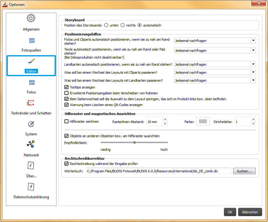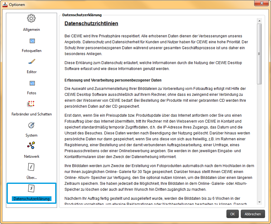 In den Optionen finden Sie einige Einstellungsmöglichkeiten, die Ihnen die Arbeit mit der Software erleichtern können. Sobald Sie auf den Punkt "Optionen" klicken, öffnet sich ein neues Fenster, dass in unterschiedliche Kategorien aufgeteilt ist, die Sie in der linken Spalte finden. Automatisch starten die Optionen mit der Kategorie "Allgemein". Zudem können Sie an- und abwählen, ob der Tipp des Tages bei Programmstart angezeigt wird, wie auch das automatische Öffnen des Fotobuchassistenten, beim Starten eines neuen Projektes. Eine Kategorie weiter unter "Fotoquellen" können Sie bestimmen mit welcher Bilderordner bei Programmstart links zur Verfügung stehen soll, wie auch weiter Bildquelle, wie Facebook oder Picasa. Wenn Sie noch speziellere Anforderrungen an die Arbeit mit Ihren Bildern haben, dann können Sie in der Kategorie "Fotos" weitere Einstellungen vornehmen, wie das Abschalten der automatischen Bildkorrektur. Alle Infos rund um die Datenschutzrichtlinien können Sie hier im Bereich "Datenschutzerklärung" nachlesen. Zudem finden Sie hier auch eine Kontacktmöglichkeit, falls Sie weiter Fragen speziell zu diesem Thema haben. Liebe Grüße