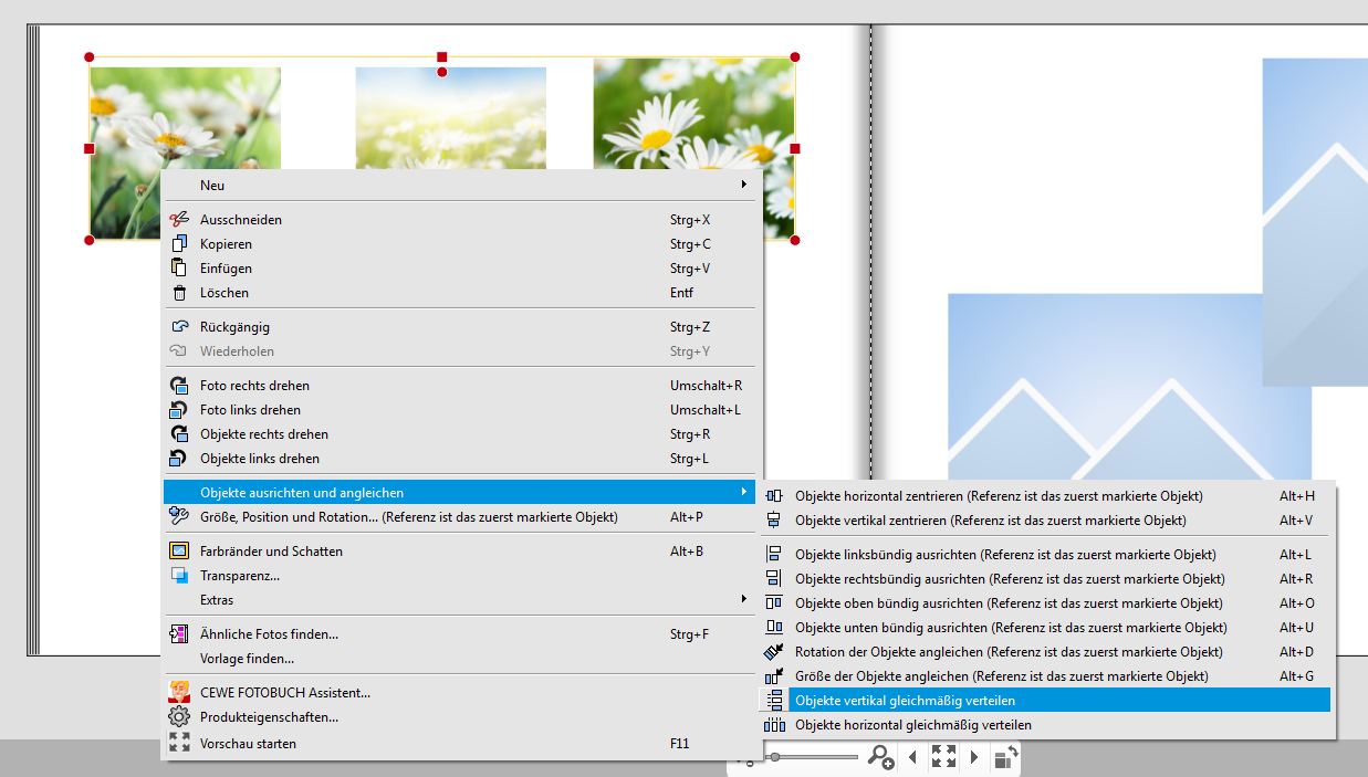 Manchmal gestalten Sie eine Seite mit mehreren Bildern, die den gleichen Abstand von einander haben sollen. Bisher mussten Sie hierfür mit Hilfe des Rasters und Pfeiltasten arbeiten. Nicht immer war das Ergebnis jedoch nicht 100% genau. Ebenso benötigte man hierfür Zeit und Geduld. Der Wunsch, dies einfacher gestalten zu können, lag daher nicht fern. In der Version 6.0.2 finden Sie hierfür nun eine Funktion, die dies automatisch übernimmt.