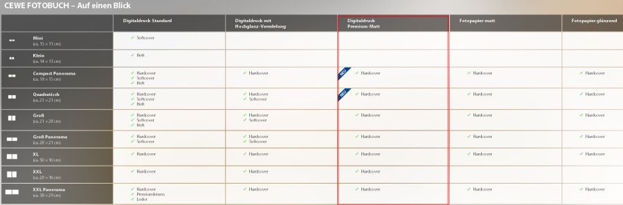 Hallo Bäuerin, seit der Veröffentlichung der Version 6.1.0 im September letzten Jahres werden zusätzliche Formate für Premium Matt angeboten. XXL und XXL-Panorama gibt es - glaube ich - sogar schon länger. Re: Zurückhaltend im Auftritt und edel in der AnmutungPremium matt war jetzt länger mein absoluter Favorit. Aber bei hartem Licht konnte mich die Oberfläche dann doch nicht so ganz überzeugen. Habe jetzt mal den Premium Digitaldruck ausprobiert und bin davon so richtig begeistert! Trotzdem bleibt Premium matt weiterhin in der engen Auswahl. Mehr bräuchte ich bei den Büchern gar nicht.